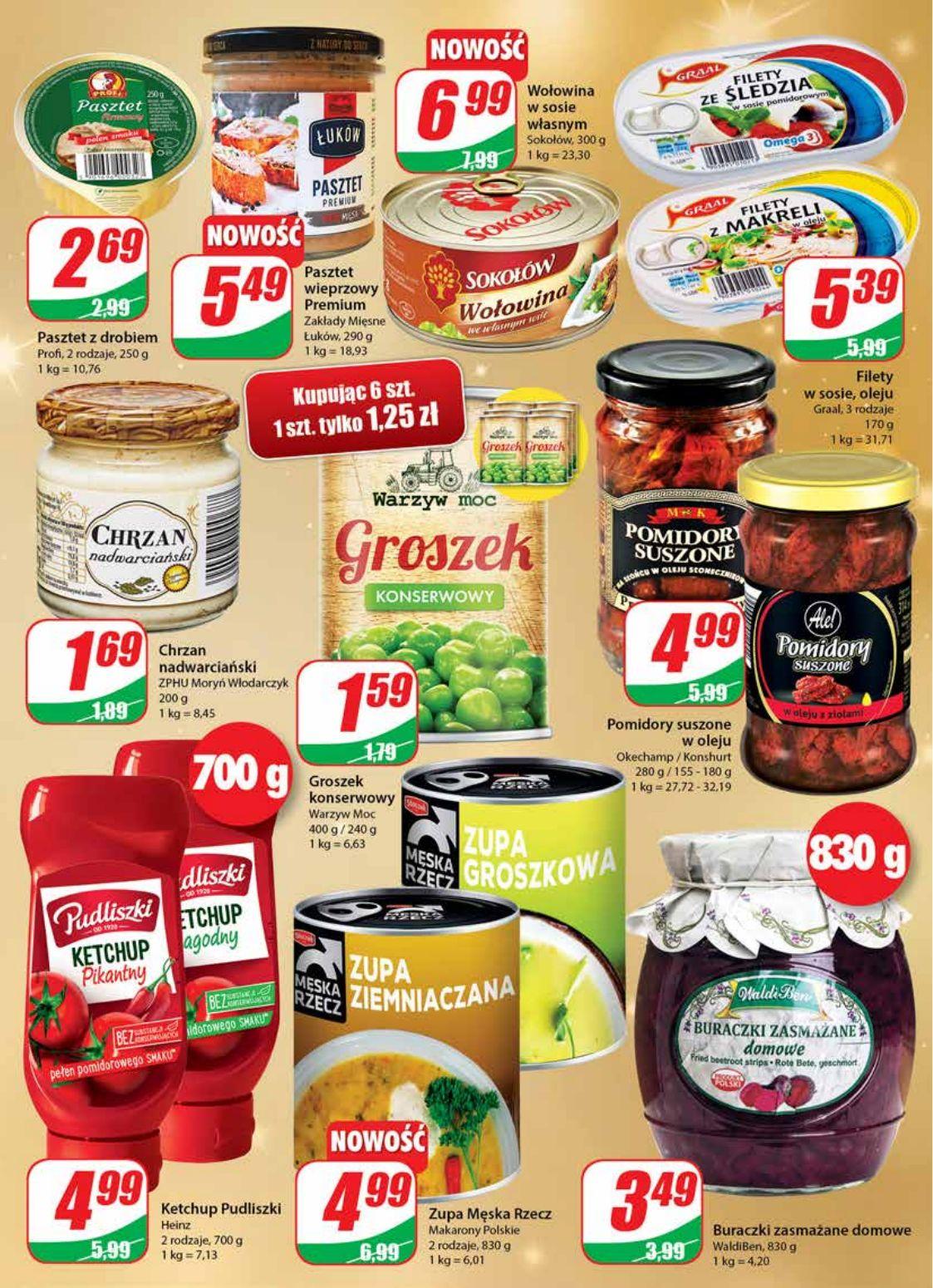 pasztet,ketchup,zupa ziemniaczana,buraczki,groszek,chrzan,śledzie,wołowina
